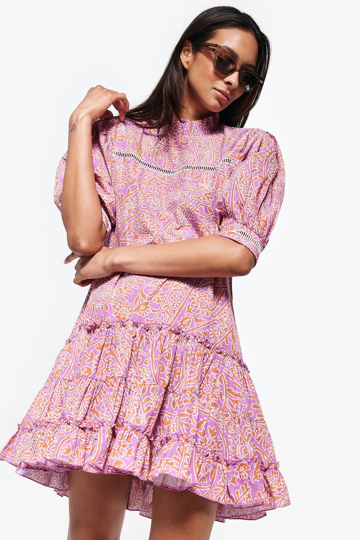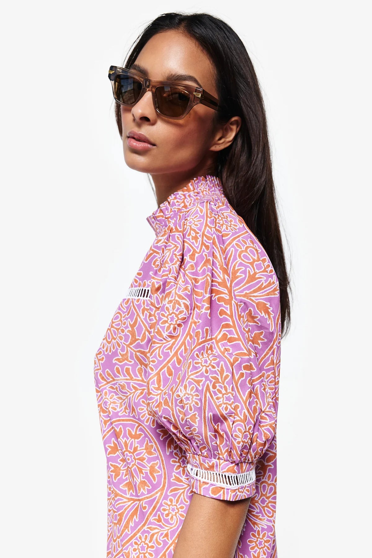 - Printed dress with a high neck, pouf sleeves and lace detailing