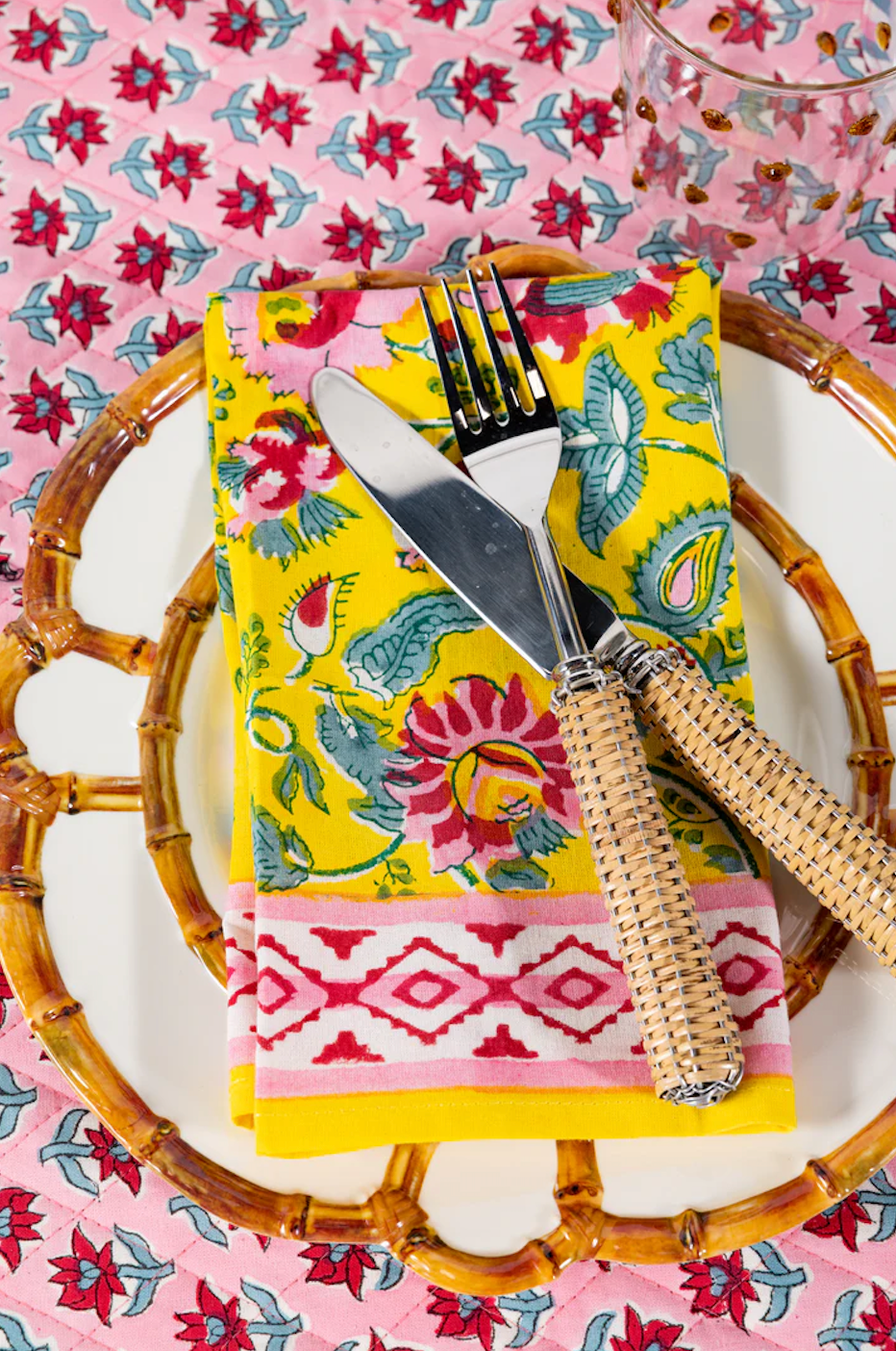 Make your meals extra festive with our exclusive blockprint napkins. Handmade in India , the charming color combo and the striped trim make a bold statement. By opting for sustainable table linens over disposable, we can help cut down on waste and support an age-old craft by artisans in Jaipur.