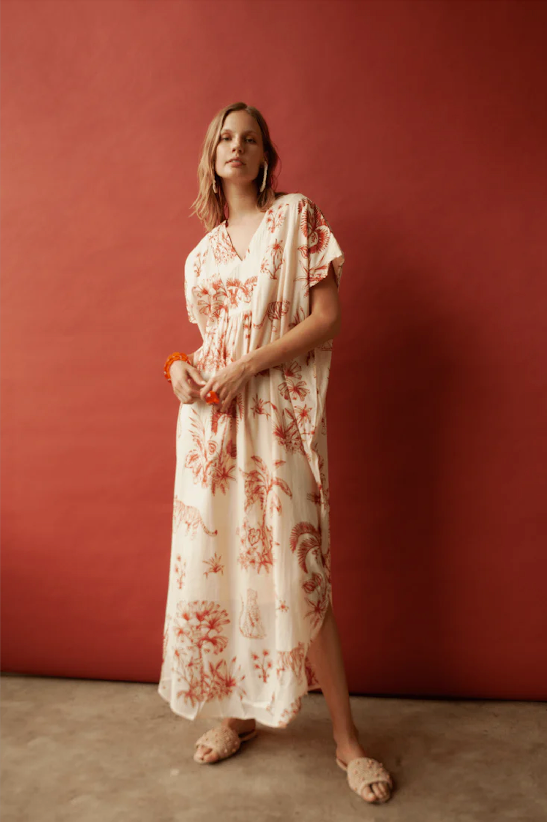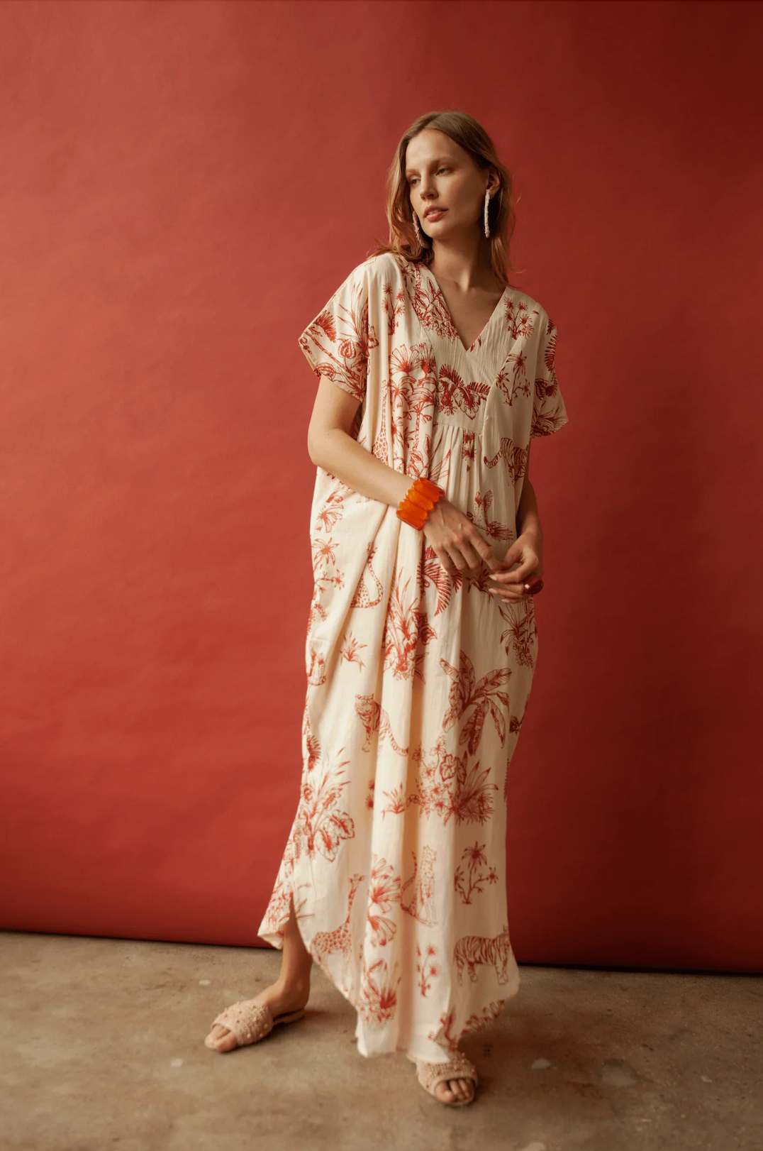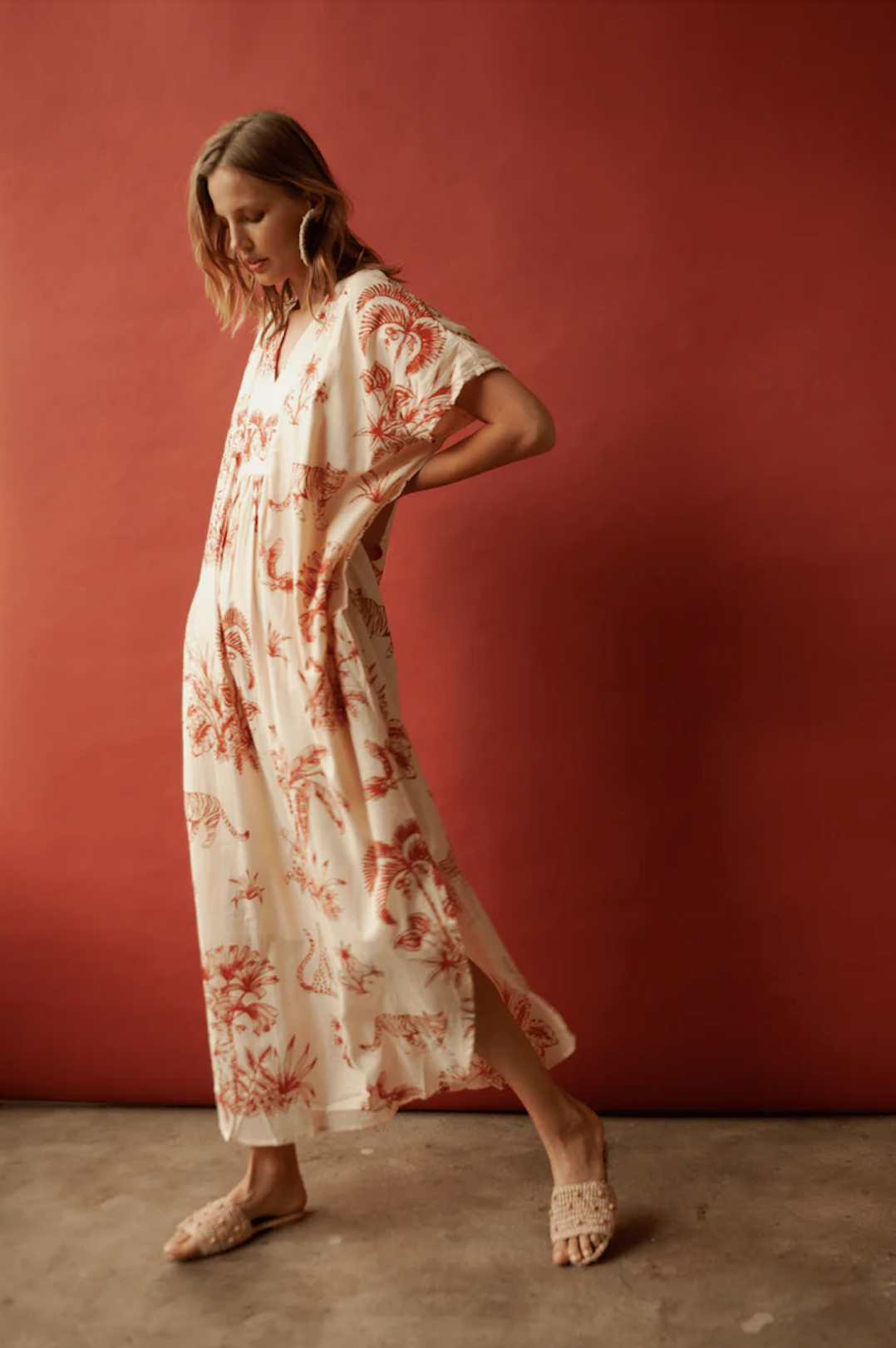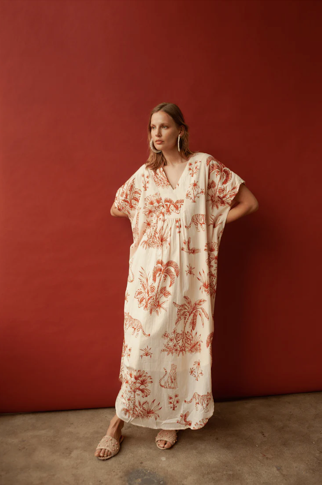 Our Zola Kaftan Tassel in a billowy cotton and a bold Ikat, It’s handmade by artisans using the block print technique. The kaftan has great movement when you walk, whether that’s on the beach or in the city.The dress falls below the knee and its side slits make it more comfortable. The flowing and graceful style is inspired by our Latin American / Colombian heritage combined with elements of Indian culture. Every piece has been crafted with care and represents the eternal values of that tradition keep alive.