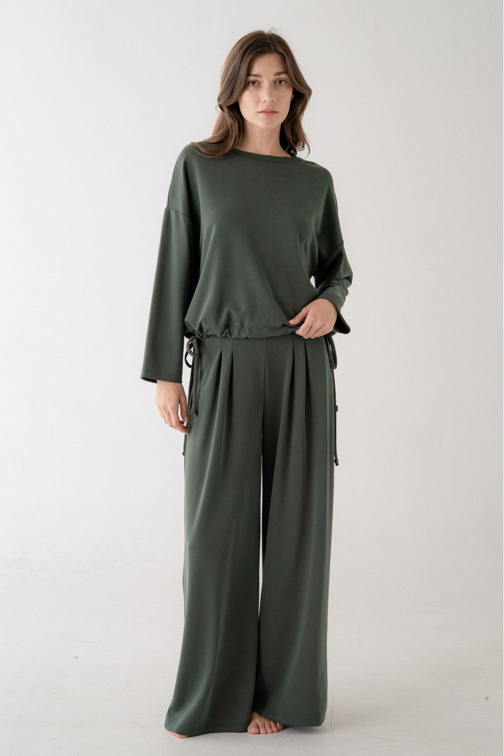 Long sleeve top with bow detail at the hem. Pleated pants.
